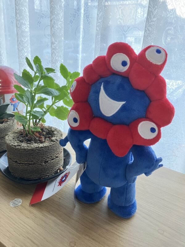 ただ会社の研修で行ってきた家族がいて、お土産に噂のミャクミャクぬいぐるみを買ってきてくれました!