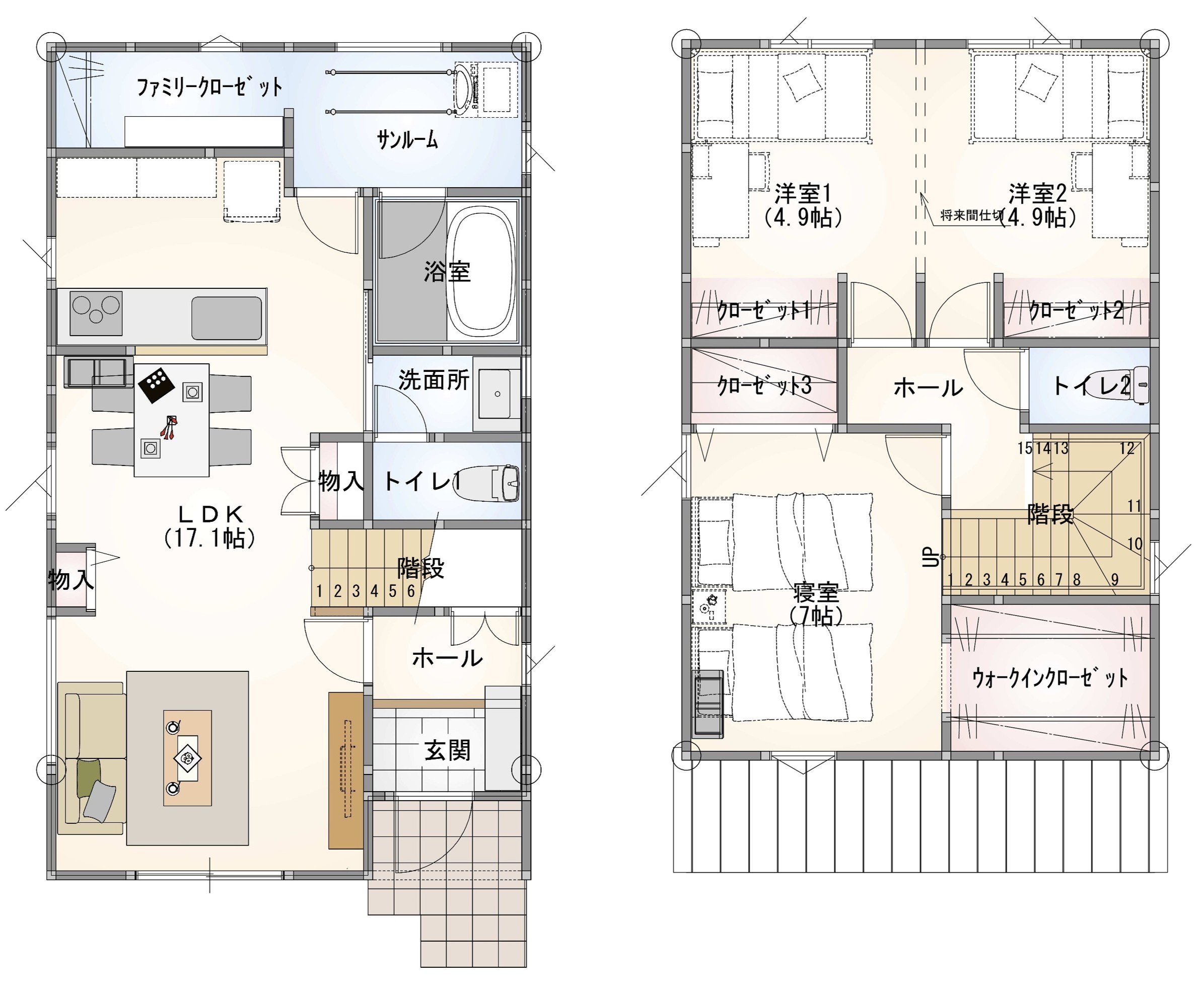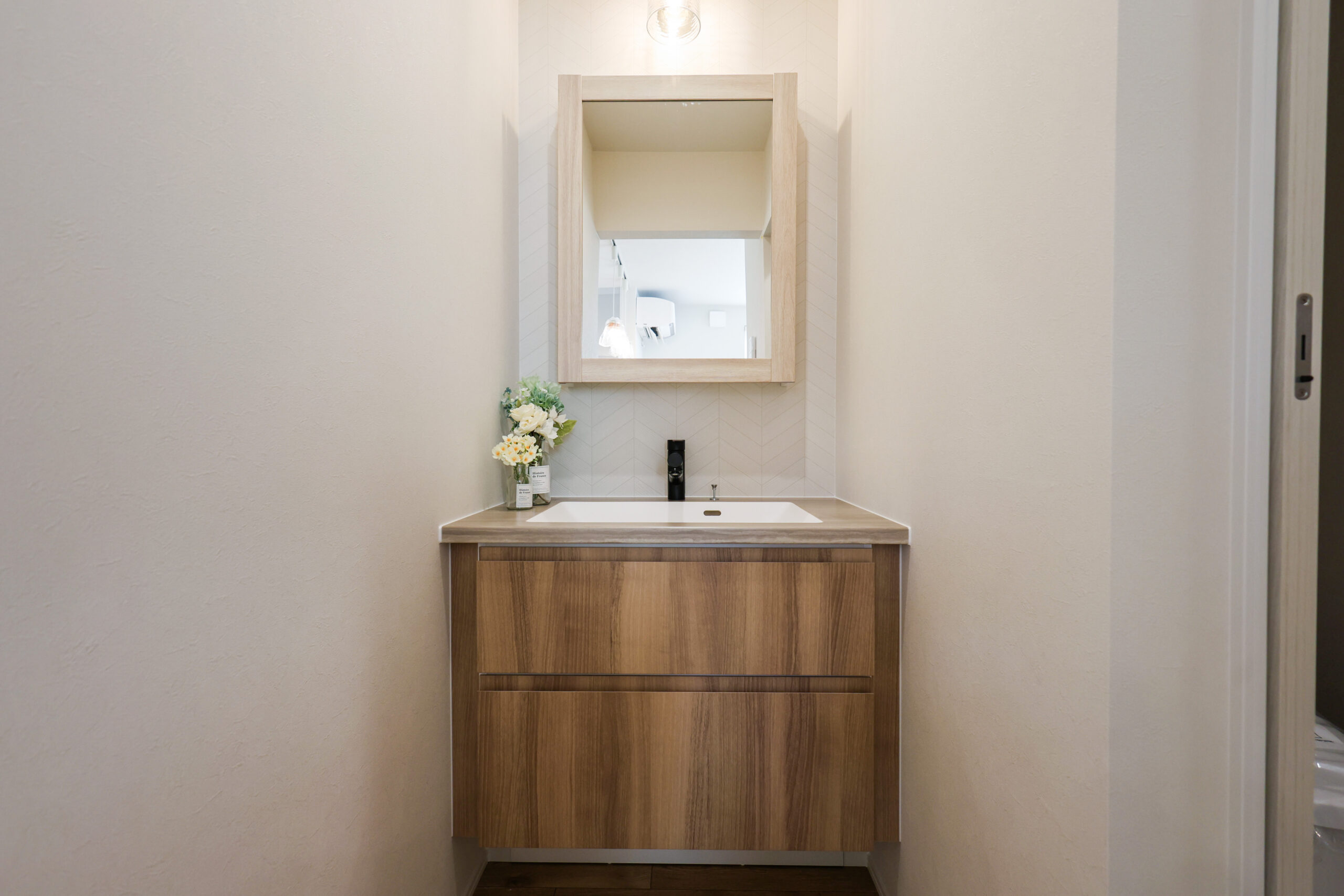 使いやすい独立した洗面所や、お洗濯が一箇所で完結できるサンルーム兼ファミリークローゼット。水廻りの使いやすさを重視した家事ラクを実現した間取りです。