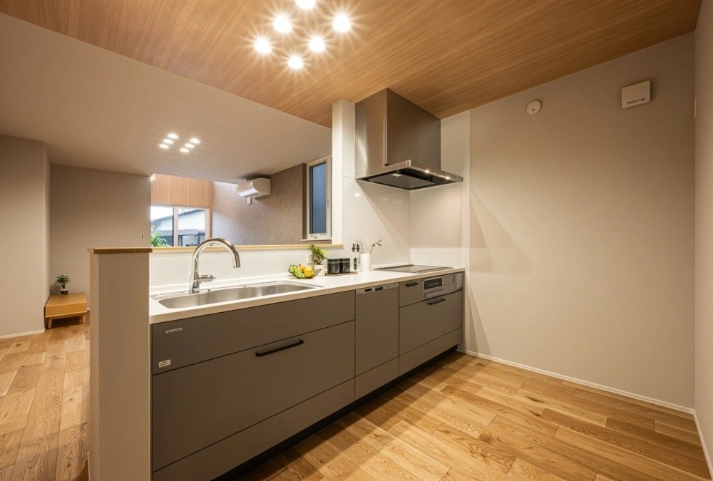 キッチン上部の木目の折下げ天井や